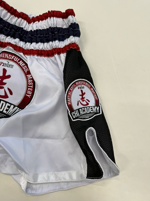 De brede elastische tailleband in de Thaise kleuren zorgt voor een stevige maar comfortabele pasvorm en blijft goed zitten, ook tijdens intensieve trainingen. De shorts zijn afgewerkt met 3 geborduurde Chi Academy logo’s, wat zorgt voor een krachtige, authentieke uitstraling en een hoogwaardige afwerking.